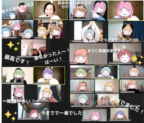 先生が優しくて、育児の悩みも気軽に相談が出来ました!「育児を学ぶ時代」という先生の言葉が印象に残っていて、「子どもの幸せを願うなら育児のいろはをプロから教わると子どももママも楽しく成長できるよ~!」と後輩ママさんに伝えたいです。私は、3回リピート受講しました!笑